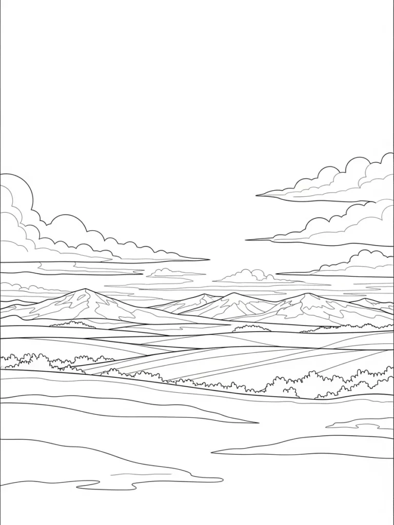 I really enjoy pages like this when I want something soothing and unhurried. Coloring the long sweeping fields feels almost like smoothing out my thoughts one section at a time. If you’re into soft color blends, this is perfect for pale blues, cozy creams, and muted grays. Every time I work on a landscape like this, it feels like standing still in a quiet winter moment with nothing asking for attention except the next color choice.