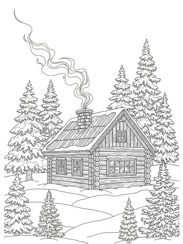 This is the perfect coloring page for creating a warm, comforting mood. I’m definitely going to use deep greens and charcoal grays for the surrounding trees to make the cabin feel invitingly sheltered. I can use soft yellows and warm reds for the cabin walls to suggest a fire is roaring inside. Coloring all those individual logs and the texture on the chimney will be wonderfully repetitive and relaxing. It’s the visual definition of serenity finding warmth and peace when everything outside is cold and quiet.