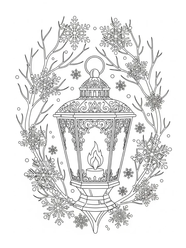 This coloring page features an elegant vintage lantern centered in a soft oval frame of winter branches and delicate snowflakes. The lantern is filled with intricate swirling patterns and fine decorative details, while a small flame glows gently inside. Surrounding it, snowflakes of varying sizes float among thin bare branches, creating a balanced circular composition that feels cozy and refined. The line work is clean and detailed without being overwhelming, giving you lots of small sections to color while still feeling open and airy.