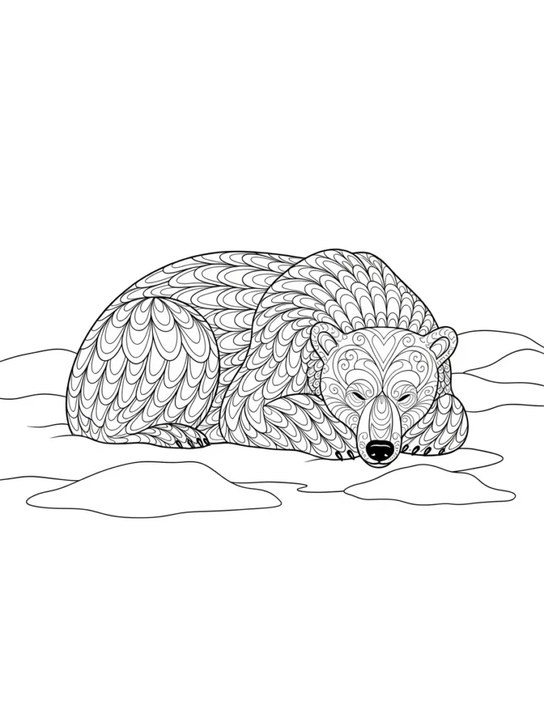 This coloring page features a peaceful bear curled up in the snow, resting quietly in a simple winter setting. The bear’s fur is filled with flowing decorative patterns that repeat across its body, creating a beautiful mix of curves and layered shapes. The face has gentle details that feel calm and expressive without being too busy, while the surrounding snow is drawn with smooth open lines that give the design plenty of breathing room. The contrast between the detailed fur and the soft background makes the bear the clear focus of the page.