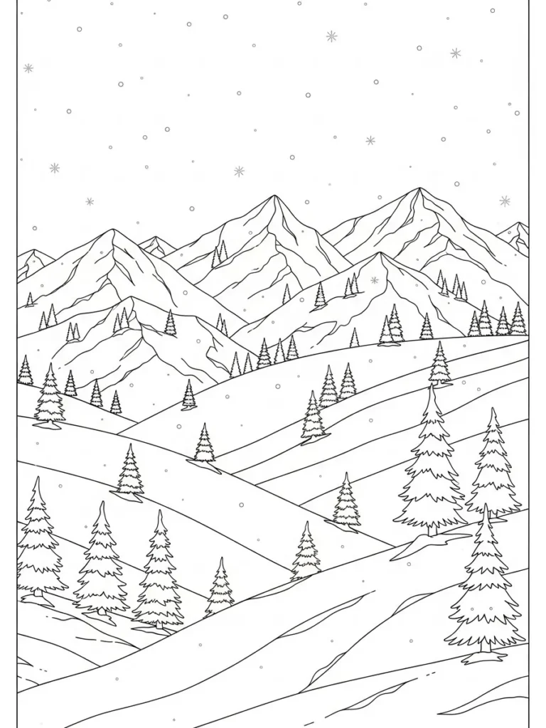 I love coloring pages like this when I want something relaxing that does not feel rushed. Coloring each hill and tree feels slow in the best way, almost like walking through the scene at my own pace. If you’re into soft winter palettes or subtle shading, this one gives you so much freedom to play. Every time I color a snowy landscape like this, it feels like a quiet reset that leaves my mind lighter than before.