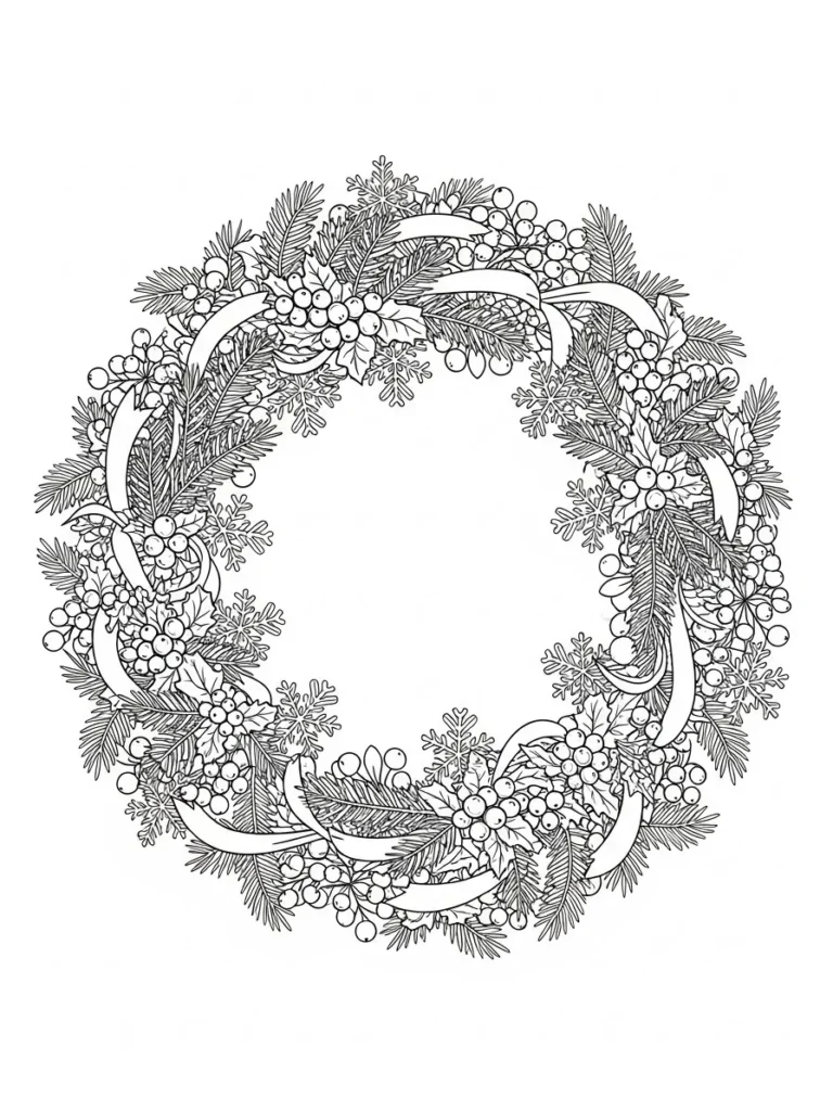 This coloring page features a beautifully detailed winter wreath made of layered pine branches, round berries, flowing ribbons, and delicate snowflake accents. The wreath forms a full circular design with a clean open center, giving the whole page a balanced and elegant feel. Fine line work fills each branch and berry with texture, while the ribbons weave gently through the greenery to add movement. The details are intricate without feeling crowded, making it perfect for slow and mindful coloring.