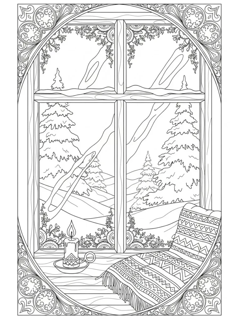 This coloring page shows a charming winter view framed by an ornate window, looking out onto snowy hills and tall pine trees. The window frame is filled with elegant swirling patterns and small decorative details that add a vintage feel, while the outdoor scene stays soft and simple. Inside the room, a flickering candle sits on the windowsill beside a patterned blanket draped casually across the ledge. The line work balances fine details in the frame and blanket with smoother open areas in the snow and sky, creating a warm and inviting layout.