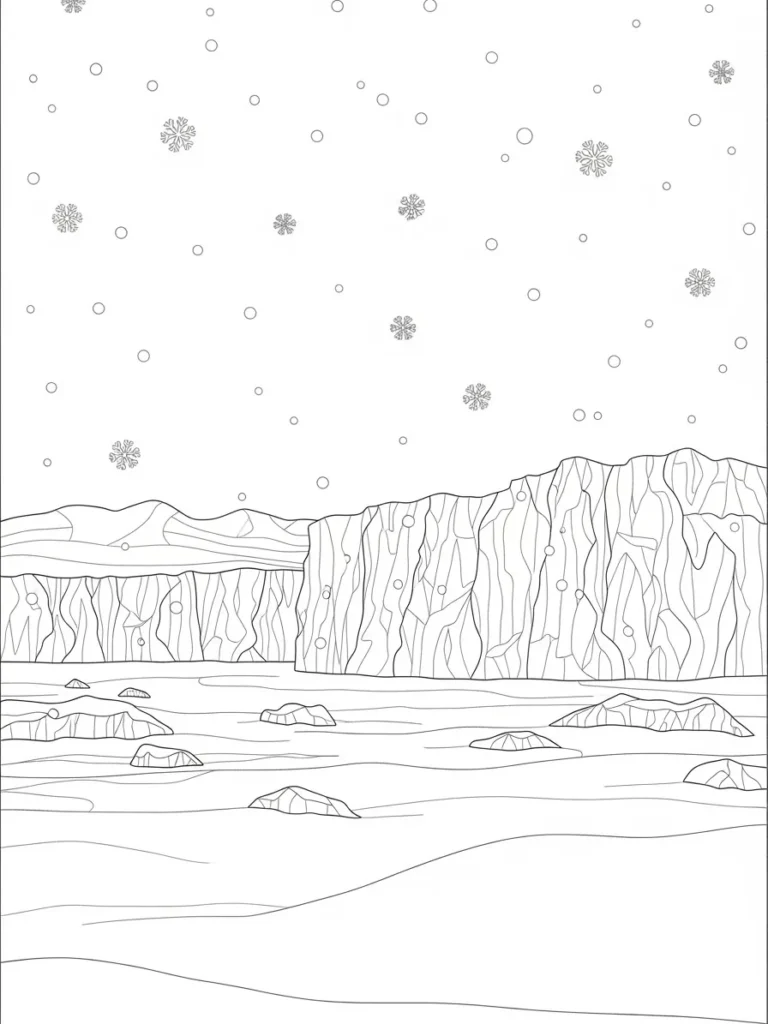 This coloring page shows a quiet winter scene with tall frozen cliffs stretching across the background and a wide snowy landscape below. Soft snowflakes drift down from an open sky, adding a gentle sense of movement to the otherwise still setting. The cliffs are filled with flowing vertical line patterns that give them texture and depth, while the ground below is smoother with scattered rocks resting in the snow. The layout feels open and spacious, with a calming balance between detailed cliff faces and peaceful empty areas.