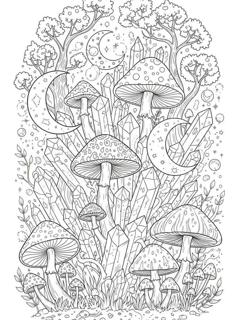 This coloring page features a whimsical witchy forest filled with oversized mushrooms, towering crystal formations, and crescent moons floating among leafy trees. The composition feels full and layered, with mushrooms of different shapes and sizes growing from the ground up through clusters of faceted crystals. Delicate stars, dots, and tiny celestial details are scattered throughout, giving the whole scene a dreamy night spell vibe. The line work is clean and detailed without being overwhelming, with a mix of smooth curves and sharp crystal edges that keep the layout visually interesting from top to bottom.