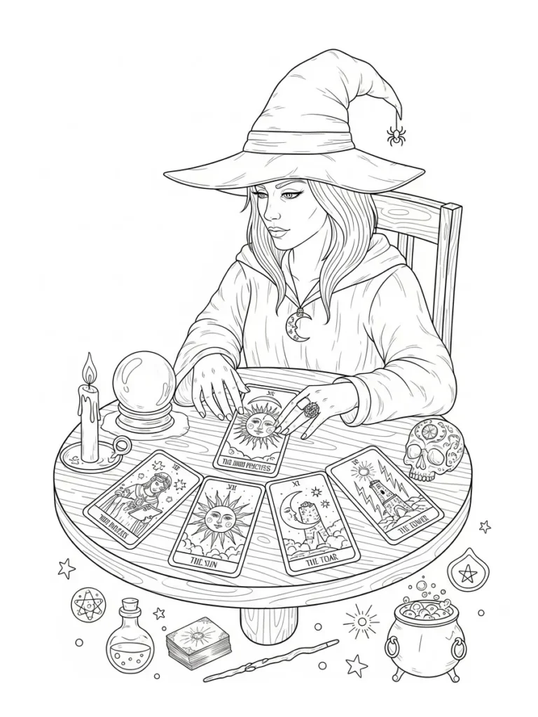 This coloring page shows a focused witch seated at a round wooden table, laying out tarot cards beneath her steady hands. A candle, crystal ball, skull, potion bottles, wand, and cauldron surround the scene, creating a cozy fortune telling setup filled with symbolic details. The tarot cards feature classic imagery like the sun and the tower, while the witch’s hat and flowing sleeves add soft movement to the composition. The line work is clean and detailed with a nice mix of bold outlines and finer textures, making the layout feel rich without becoming overwhelming.