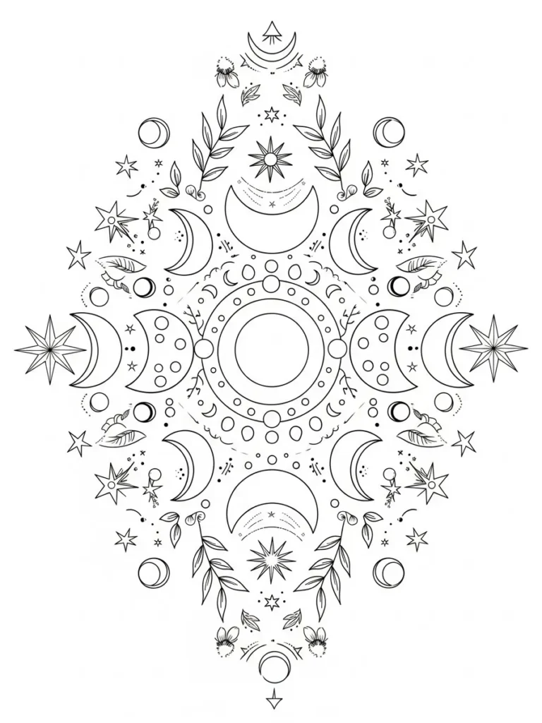 This coloring page features a symmetrical mandala inspired by the moon cycle, filled with crescent moons, full moons, stars, leaves, feathers, and tiny cosmic accents. The design radiates outward from a central circle, creating a balanced and harmonious layout that feels very intentional and calming. The line work is fine and delicate, with repeating shapes and gentle curves that guide the eye naturally around the page. Every section feels thoughtfully placed, giving the whole piece a soft mystical rhythm without feeling cluttered.
