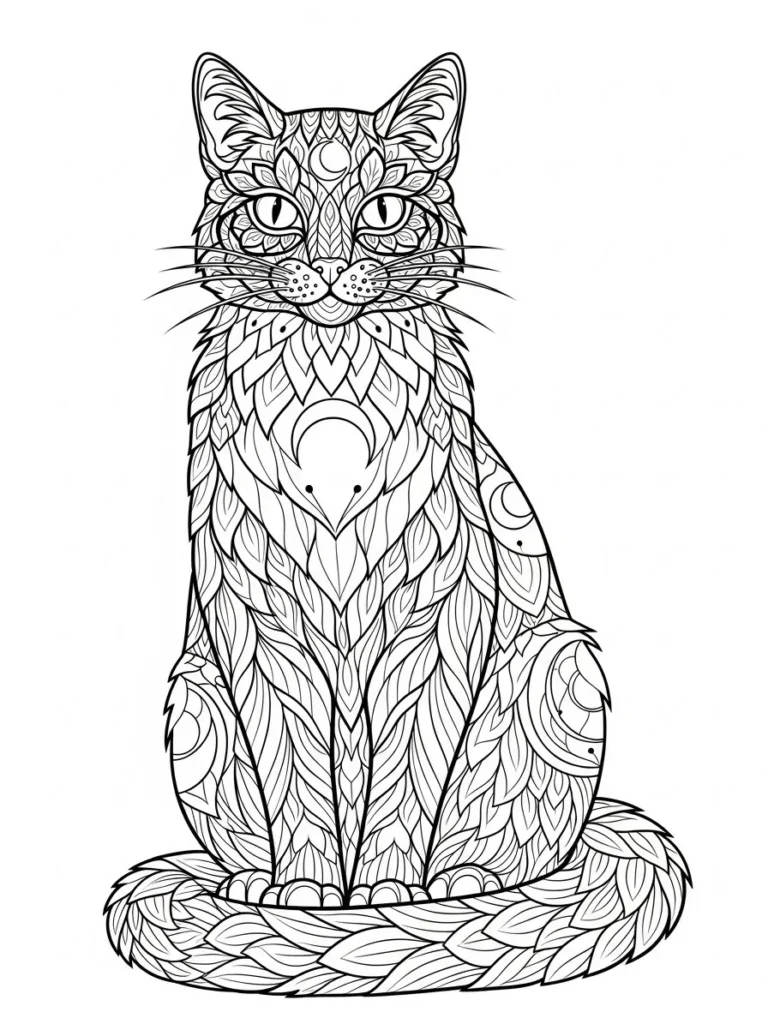 This coloring page features a seated witchy cat drawn with intricate layered patterns that flow through its fur, tail, and facial features. Moon symbols rest on the forehead and chest, adding a magical focal point that feels calm and powerful. The design uses clean bold outlines on the outer shape with finer lines inside, creating lots of small sections that feel detailed without becoming overwhelming. The symmetrical pose and centered layout give the whole page a grounded balanced look that instantly feels intentional and serene.