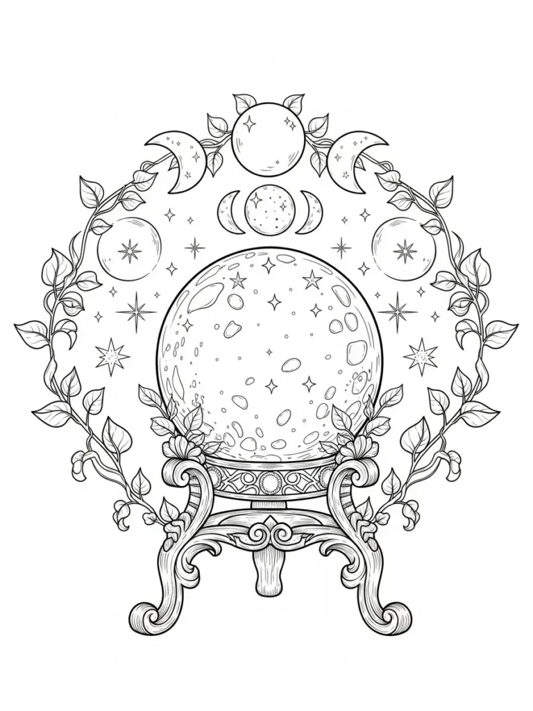This coloring page features a stunningly detailed black and white illustration centered around a large crystal ball resting on an ornate, scrolled stand. The sphere itself is textured with craters and scattered stars suggesting a celestial view within, while the surrounding area is framed by a lush vine border intertwined with various phases of the moon—crescent, full, and new—and several sparkling star shapes. The line work is crisp and delicate, offering plenty of intricate areas for focused coloring attention, especially in the elaborate base of the scrying device and the fine leaves of the surrounding foliage.