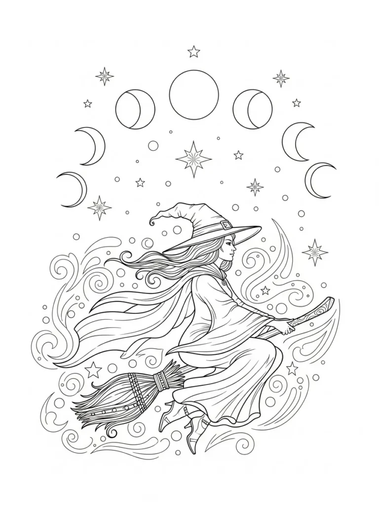 This captivating line art showcases a beautifully rendered witch soaring through the night sky on her trusty broomstick. She is depicted with long, flowing hair and robes billowing dramatically around her, suggesting great speed. Above her head, a full sequence of moon phases is clearly mapped out from crescent to full circle and back again, accompanied by various twinkling stars and swirling magical energy clouds that surround her journey. The line work is moderately thick and clean, providing excellent definition for shading the fabric folds and the mystical elements of the scene.