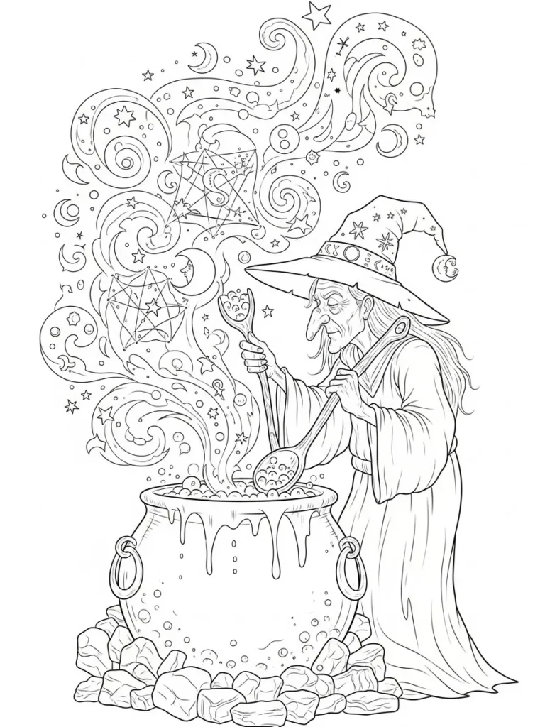 Honestly, this page is just so wonderfully whimsical and gives off such a classic Halloween vibe year-round. I think coloring the potion itself will be super satisfying, maybe using bright, unnatural greens or pinks to show off how potent it is. Plus, there is something so grounding about focusing on the texture of the robe folds and the rough stones beneath the pot. If you enjoy drawing out characters and complex magical effects, you’ll find this one truly engaging and a great way to unwind.