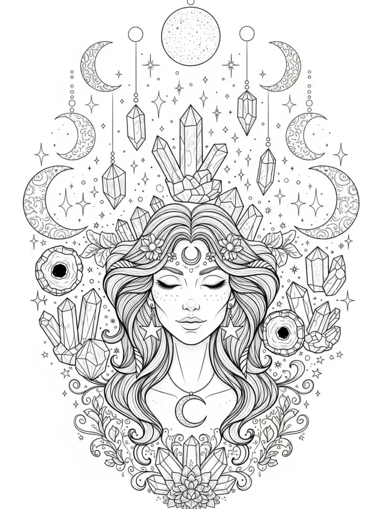 I find this page incredibly engaging because of the sheer volume of beautiful textures to focus on. Imagine using shimmering pastels or metallics on all those crystals to make them truly pop against the smooth skin tones—it’s going to look spectacular. Coloring in the soft waves of her hair and the delicate patterns inside the crescent moons feels meditative to me. This is a perfect coloring session for when you need to slow down, focus inward, and create something absolutely breathtakingly luminous.