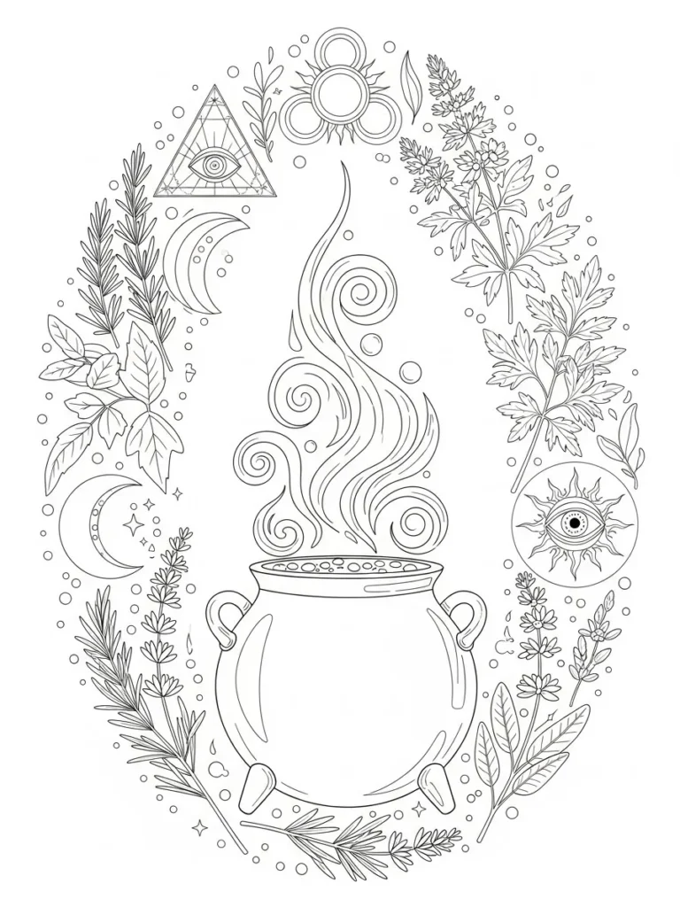This coloring page centers around a classic witchy cauldron with soft curling steam rising upward, framed by a beautiful wreath of herbs, leaves, and magical symbols. You can spot crescent moons, an all seeing eye, a triple moon style symbol, and gentle botanical sprigs arranged in a balanced circular layout. The lines are fine and elegant with plenty of open space, making it feel airy while still detailed. Everything flows nicely around the cauldron, giving the design a calm ritual inspired look that feels intentional and soothing.
