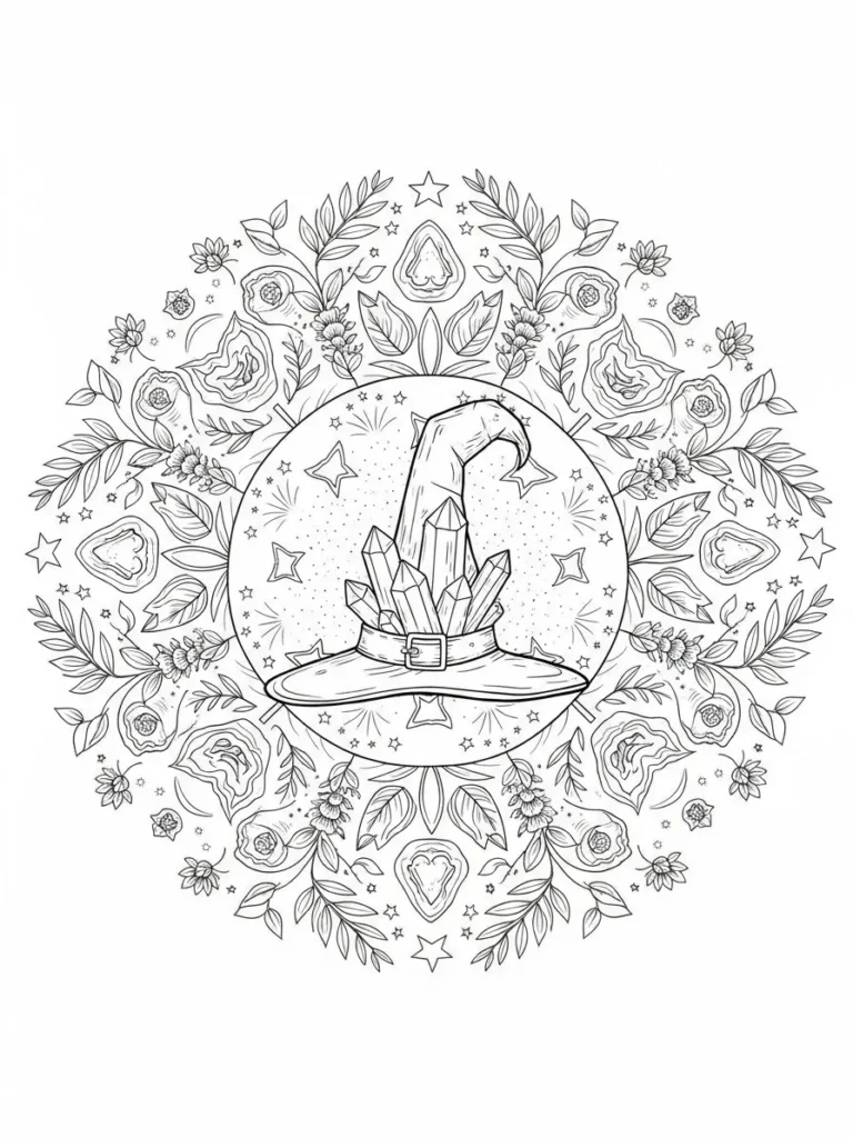 This coloring page showcases a classic witch hat sitting inside a circular frame, with sparkling crystals tucked into the band as the main focal point. Around it is a beautifully balanced floral wreath filled with leaves, blossoms, stars, and small magical details that create a soft mandala style layout. The line work is fine and elegant, with plenty of tiny sections for detailed coloring while still leaving breathing room so it never feels crowded. Everything feels symmetrical and calm, giving the design a polished witchy charm that looks magical without being too intense.