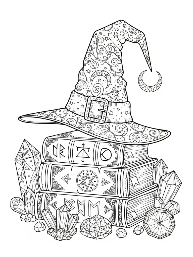 This coloring page features a cozy witchy still life with a tall stack of spellbooks topped by a floppy patterned witch hat. Each book is decorated with mystical symbols, runes, and geometric designs that add visual interest without feeling cluttered. Crystals of different shapes and sizes surround the books, creating a grounded magical atmosphere. The line work is crisp and detailed, with a nice balance of thicker outlines and finer interior patterns that make every section easy to color while still feeling rich and layered.