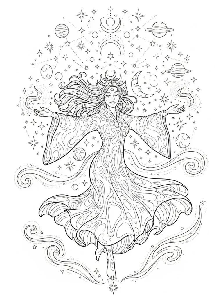 This coloring page features a graceful witch floating or dancing in a cosmic space filled with moons, stars, and distant planets. Her flowing dress and sleeves are covered in soft swirling patterns that echo the movement of the universe around her. Crescent moons and celestial symbols arc above her head, creating a dreamy halo effect, while tiny stars and orbits fill the background without overpowering the main figure. The line work is elegant and detailed, with smooth curves and gentle repetition that keep the design balanced and visually soothing.