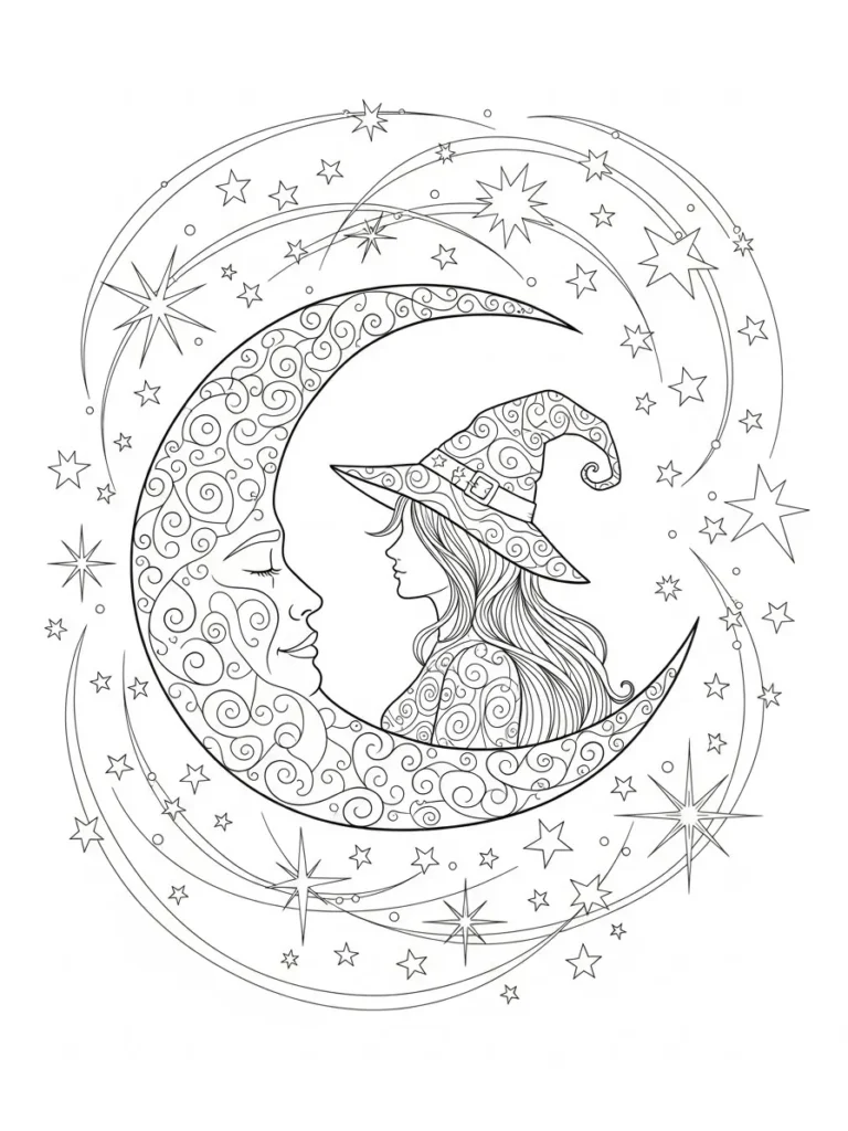 This coloring page features a serene witch profile nestled inside a large crescent moon that also carries a softly smiling moon face. Flowing lines and swirling patterns fill the moon, the witch’s hair, and her hat, creating a dreamy layered look that feels calm and magical. Shooting stars, tiny sparkles, and curved star trails surround the central design, giving the whole page a sense of motion without feeling busy. The line work is delicate but clear, with lots of small details balanced by open spaces that make coloring feel smooth and enjoyable.