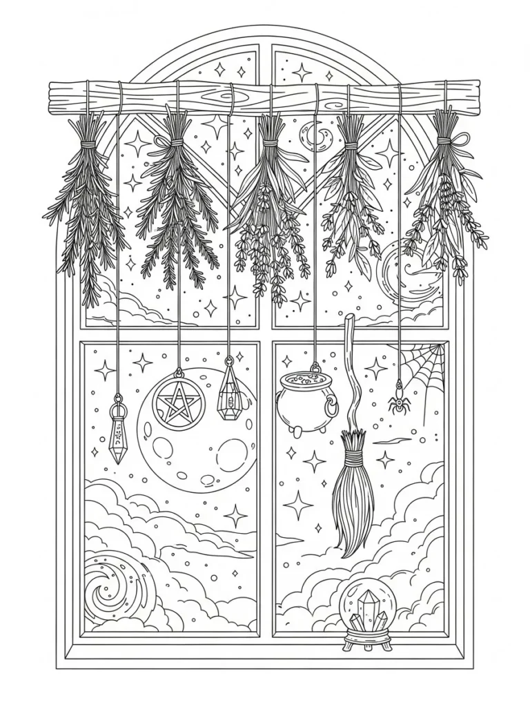 This lovely illustration captures a cozy witch’s window scene looking out onto a magical night sky. Hanging from the top wooden beam are several bunches of drying herbs like lavender and rosemary, creating a beautiful garland effect. Suspended across the window panes are various witchy tools including a crystal point, a cauldron, a broomstick, a pentacle charm, a lantern, and a crystal ball resting on the bottom sill, all set against a backdrop featuring a large full moon, soft clouds, stars, and a tiny spiderweb in the corner. The overall line quality is clean and moderately thin, perfect for detailed coloring.