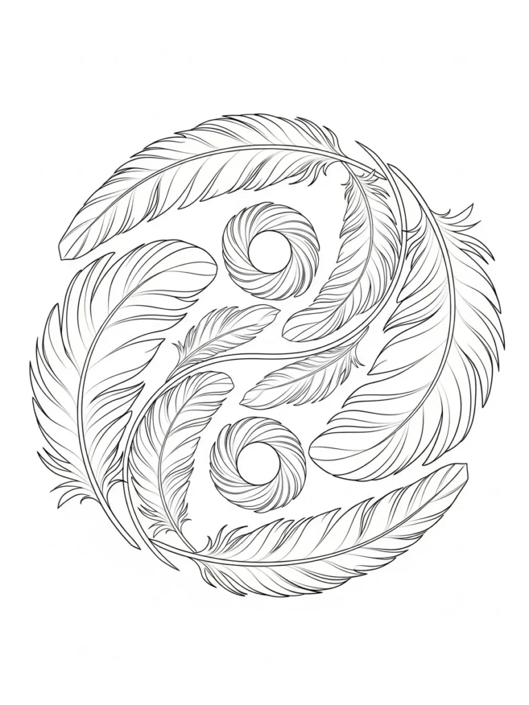 This coloring page reimagines the yin yang symbol using soft flowing feathers that curve and overlap in a graceful circular motion. Each feather is outlined with fine clean lines and gentle inner details that mimic natural feather textures without feeling too dense. The two inner circles echo the same swirling feather pattern, keeping the design cohesive and balanced. The overall layout feels light and airy, with plenty of open space between the lines that makes the page feel calm and elegant.