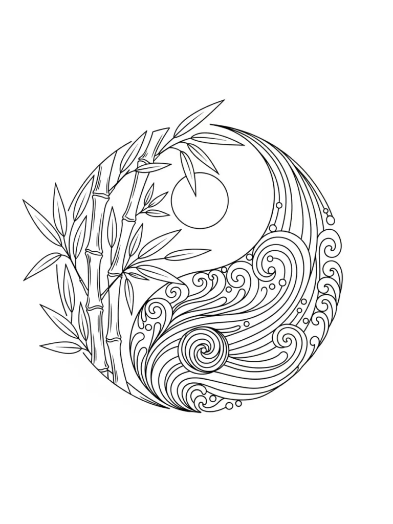 This coloring page blends the yin yang symbol with natural bamboo stalks and flowing water patterns in a beautifully balanced circle. One side features tall bamboo stems with slim leaves that curve gently outward, while the other side is filled with swirling water lines and soft curls that feel fluid and calming. The line work is clean and graceful, with a nice mix of open space and detail that keeps the design light but interesting. Everything flows smoothly together, giving the page a peaceful and grounded feel.