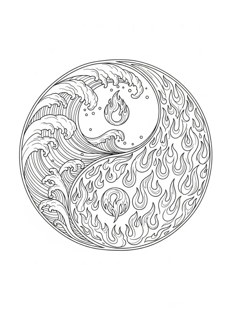 This coloring page brings the yin yang symbol to life through the powerful contrast of fire and ocean waves. One half is filled with rolling water curls and foamy wave crests that flow smoothly around the circle. The other half crackles with layered flame shapes that rise and flicker in repeating patterns. Each side mirrors the other in movement while keeping its own personality, and the line work stays crisp and bold enough to handle both soft shading and vibrant colors.