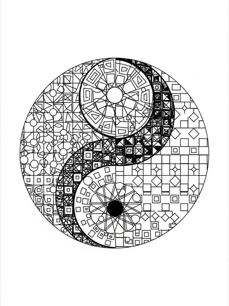 This coloring page features a bold yin yang design built from an eye catching mix of geometric patterns and shapes. Each section is filled with squares, circles, grids, and angular motifs that contrast beautifully with the smooth curve of the yin yang flow. Some areas feel structured and orderly while others are more playful and dense, creating visual balance across the circle. The line work is crisp and slightly varied in thickness, which helps each pattern stand out without making the page feel chaotic.