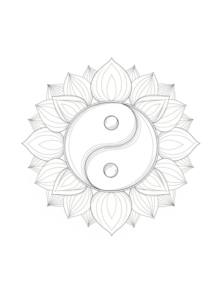 This coloring page features a classic yin yang symbol nestled inside a soft lotus mandala. Layered lotus petals radiate outward in neat symmetry, each petal outlined with gentle inner lines that add depth without crowding the design. The yin yang center is smooth and balanced, with clean curves that contrast beautifully against the structured floral shapes. Line thickness stays light and even, giving the whole page a serene and graceful look.