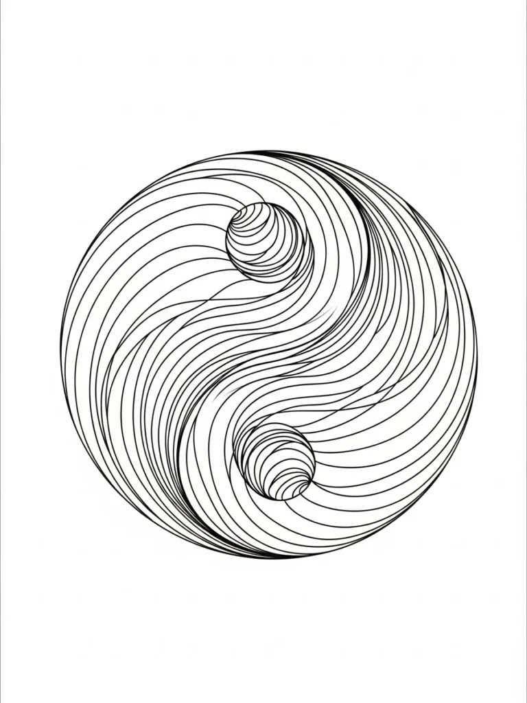This coloring page features a clean and modern yin yang design made entirely from smooth flowing lines that wrap gently around the circle. The curves sweep inward and outward in a continuous motion, creating a sense of calm movement without extra patterns or textures. Line thickness stays consistent and elegant, giving the page an airy look that feels balanced and uncluttered. The inner circles echo the same flowing line style, keeping everything visually cohesive and soothing.