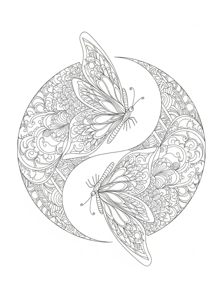 This coloring page blends the yin yang symbol with two beautifully detailed butterflies arranged in perfect balance inside a circular frame. Each butterfly mirrors the other, with delicate wings filled with layered patterns like petals, swirls, scallops, and fine textures that feel intricate without being overwhelming. The background sections are packed with ornamental designs that contrast nicely with the smoother yin yang curves, and the line work stays crisp and elegant throughout. Everything feels thoughtfully placed, creating a soft flow that guides your eyes around the page.