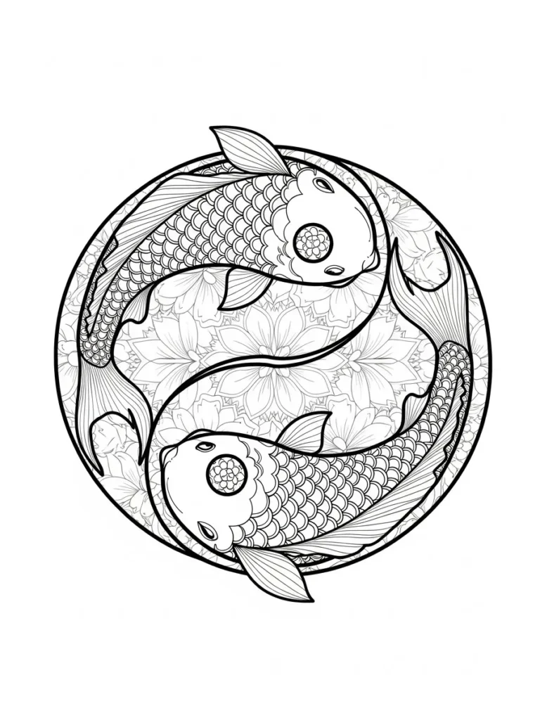 This coloring page features two graceful koi fish forming a yin yang shape as they swim in a perfect circular flow. Each fish is detailed with layered scales, flowing fins, and gentle facial features that feel expressive and calm. The background is filled with soft floral patterns that add texture without overpowering the fish. Clean confident outlines define the koi while finer inner lines invite careful coloring and shading, creating a beautiful balance between detail and open space.