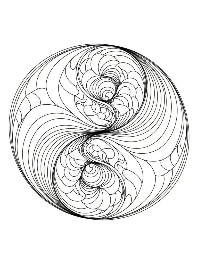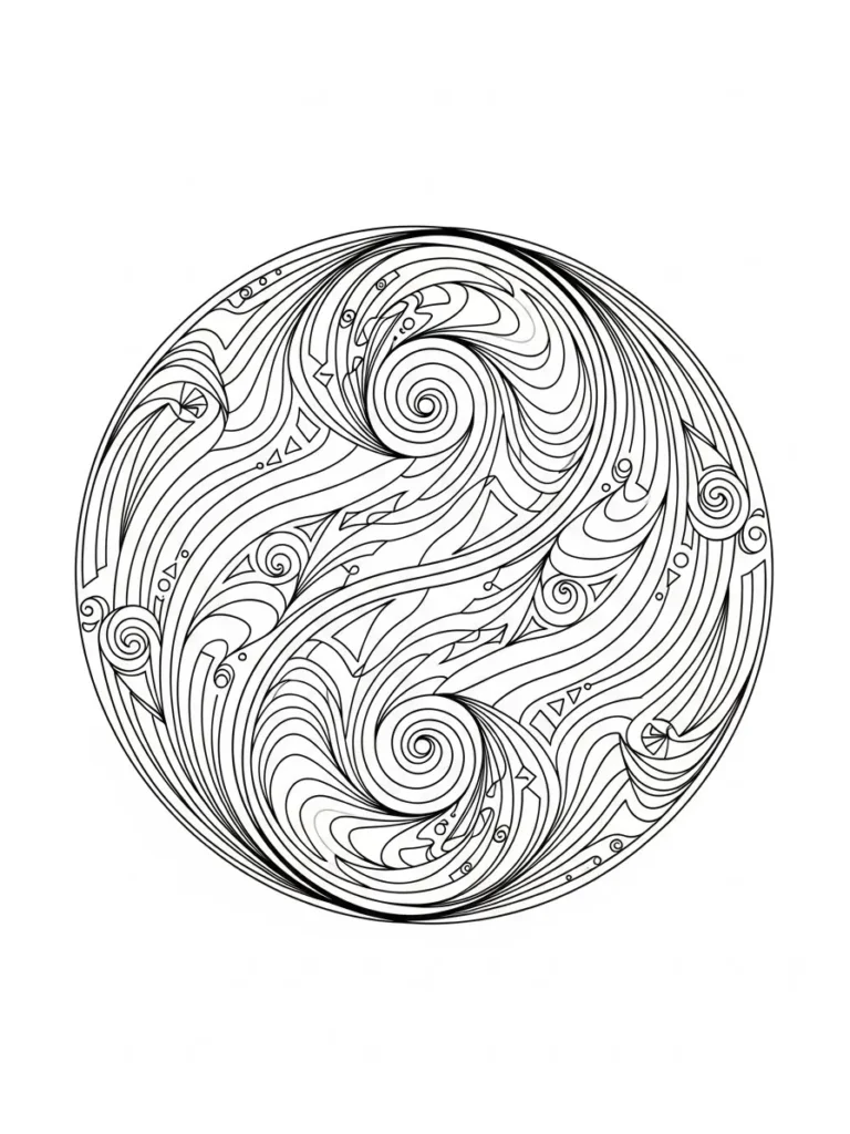 This coloring page features a yin yang design built from flowing spirals, curved ribbons, and tiny geometric accents that swirl across the circle. Each half mirrors the other through layered lines that bend and loop inward, creating a sense of motion that feels balanced and intentional. The patterns shift between smooth curves and small detailed shapes, which keeps the design visually rich without feeling overwhelming. Line thickness stays clean and consistent, making every section easy to follow while still offering plenty to color.