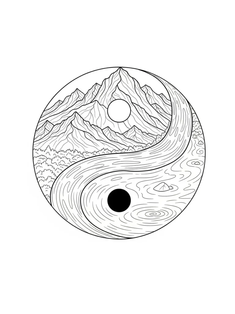 This coloring page blends the yin yang symbol into a peaceful nature scene with mountains, flowing water, and a calm circular composition. One side features layered mountain peaks with fine contour lines and gentle textures that give the landscape depth and movement. The other side flows into a winding river filled with smooth ripples and soft curves, creating a beautiful contrast between solid land and fluid water. The line work feels clean and balanced, with enough detail to stay interesting while still leaving open areas to breathe.