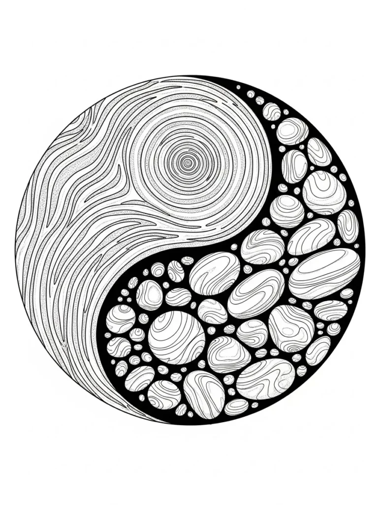 This coloring page presents a yin yang design filled with natural textures that feel earthy and soothing. One side is made up of smooth flowing lines that curve gently like water or wind, while the other side is packed with rounded stone shapes layered in different sizes. Each stone has soft contour patterns that add interest without feeling too busy. The contrast between the open flowing lines and the clustered pebble details creates a beautiful balance, all framed neatly inside a bold circular outline.