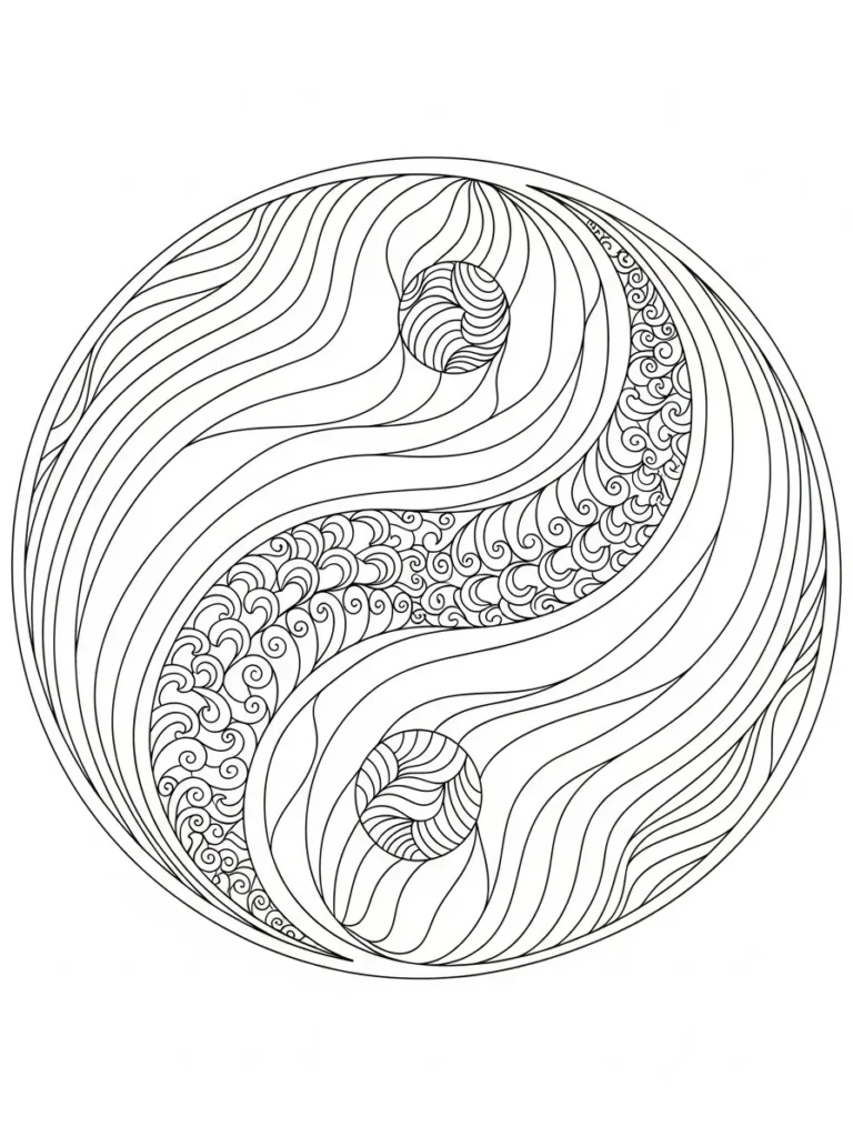 This coloring page features a flowing yin yang design made up of long graceful curves paired with dense swirling textures. One half is filled with smooth wave like lines that stretch and bend across the circle, while the other half is packed with tiny curls and spirals that add depth and contrast. The two small inner circles echo the same pattern styles, tying everything together in a really satisfying way. Line thickness stays clean and even, giving the whole design a gentle rhythm that feels balanced and calm.