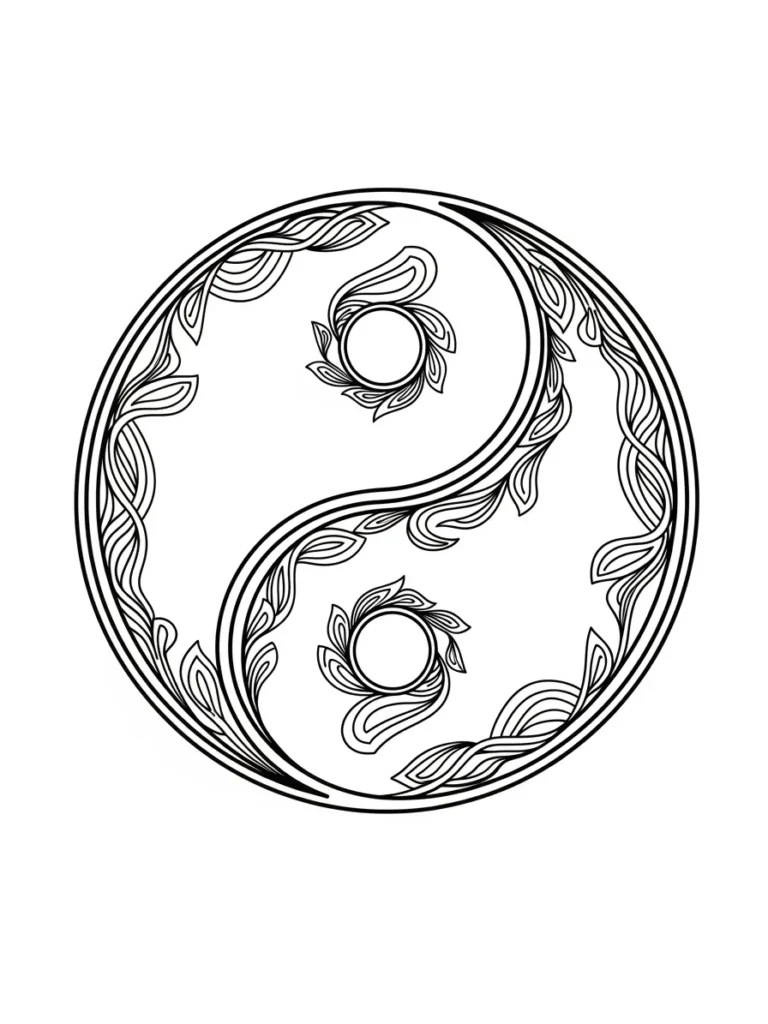 This coloring page turns the yin yang symbol into a flowing circle of delicate leaves and winding stems. Each half is filled with graceful botanical lines that curve naturally, with small leaves branching off in different directions to create movement and balance. The inner circles echo the same leafy theme, tying the whole design together in a soft and organic way. Line thickness stays light and elegant, giving the page an airy feel that never looks crowded.