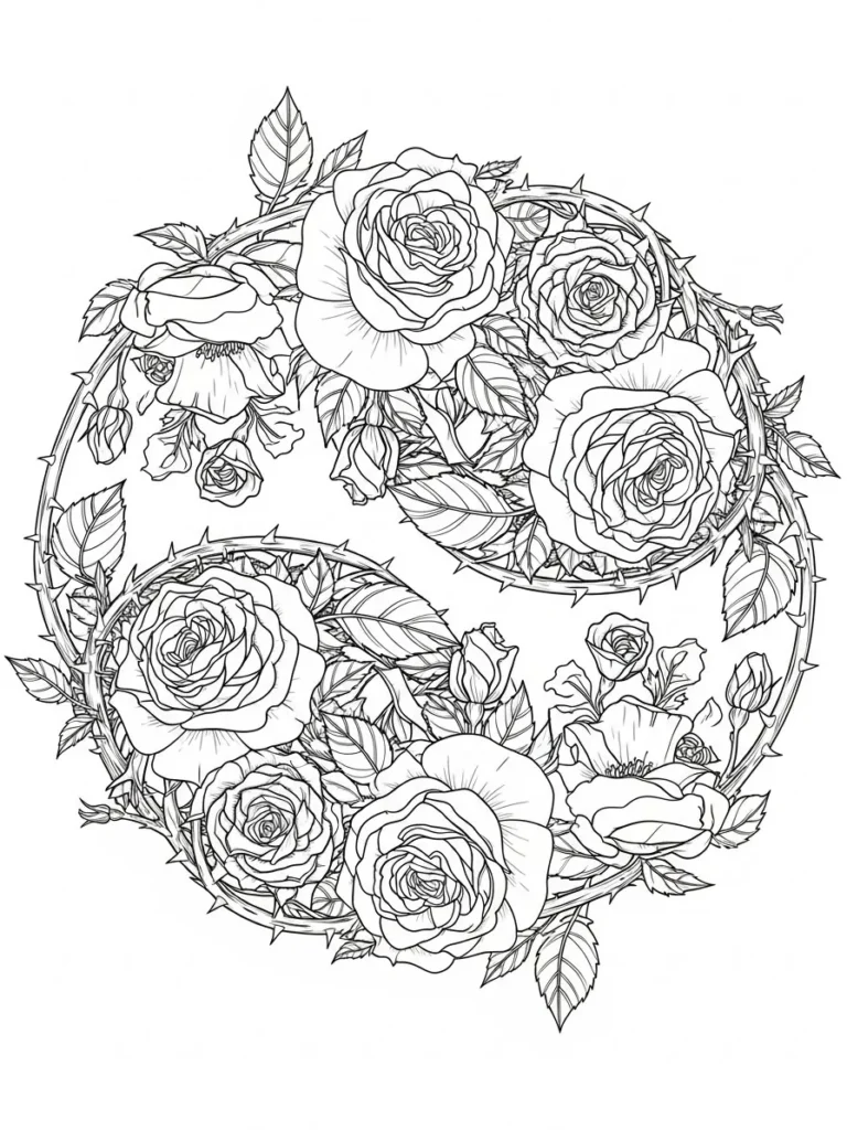 This coloring page transforms the yin yang shape into a lush floral wreath filled with blooming roses, leafy vines, and softly curving stems. The flowers vary in size and openness, with layered petals that feel full and romantic, while thorned vines trace the yin yang flow and hold everything together. Fine line details in the leaves and petals add texture without making the page feel too crowded. The overall layout feels organic and balanced, with the florals naturally guiding your eye around the design.